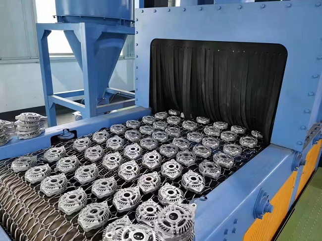 通過式履帶拋丸機的作業(yè)原理是將必定數(shù)量的工件放入倉,然后封閉閘口,機器啟動,工件由滾筒驅(qū)動開始翻轉(zhuǎn)。與此同時,投擲的炮彈形成扇形波束,均勻擊中工件表面,中止整理。拋出的彈丸和沙粒從履帶上的小孔流入螺旋輸送機,然后被送入提升機,然后在別離器中中止別離。